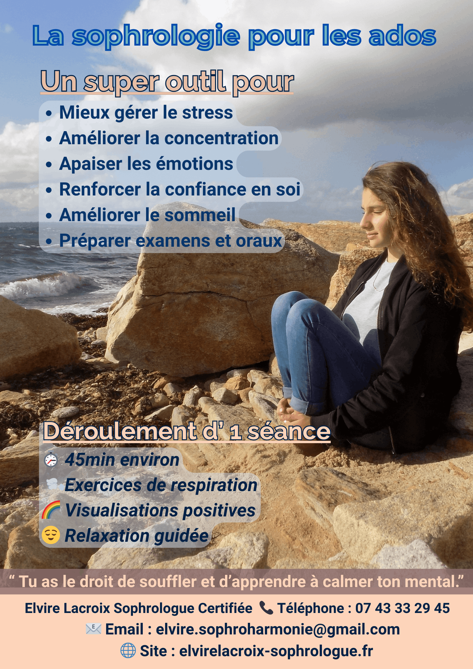 La sophrologie t’apprend à regarder sans juger. Regarde tes pensées et tes émotions avec bienveillance, sans te laisser submerger. La sophrologie...